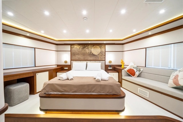 BAY C & F, a 23-meter trawler motor yacht launched in 2023, epitomizing luxury and comfort on the open sea. Accommodating up to nine guests across four cabins—three master suites and one twin cabin—this yacht ensures a spacious and elegant stay for families and groups alike.