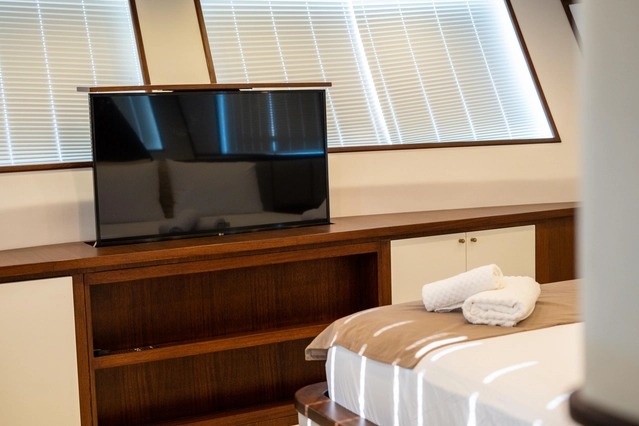 The interior boasts modern design elements complemented by aesthetic décor, creating a serene and inviting atmosphere. Expansive windows throughout the yacht allow natural light to flood in, offering uninterrupted views of the surrounding seascape. The fully equipped kitchen caters to all culinary needs, ensuring delightful dining experiences onboard.