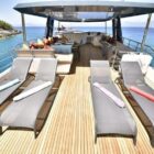 The yacht’s interior is thoughtfully designed, featuring spacious and elegantly decorated cabins equipped with air conditioning and private bathrooms, ensuring a comfortable stay. The main salon offers ample seating and large windows, allowing guests to enjoy panoramic sea views in a relaxed setting.