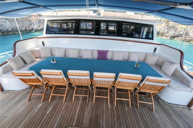 Designed with relaxation and luxury in mind, Tarkan 5’s expansive deck invites you to soak up the sun and savor the sea breeze. The yacht features generous sunbathing areas, plush seating arrangements, and a stylish bar, creating the perfect setting for socialising and enjoying the open waters.