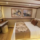 Inside, the warm wooden accents and elegant design elements create a modern yet cozy ambiance. The spacious lounge is thoughtfully designed with comfortable seating and entertainment systems, ensuring a delightful experience at sea. Every detail has been meticulously curated to offer the perfect balance of comfort and sophistication, making you feel right at home on the water.